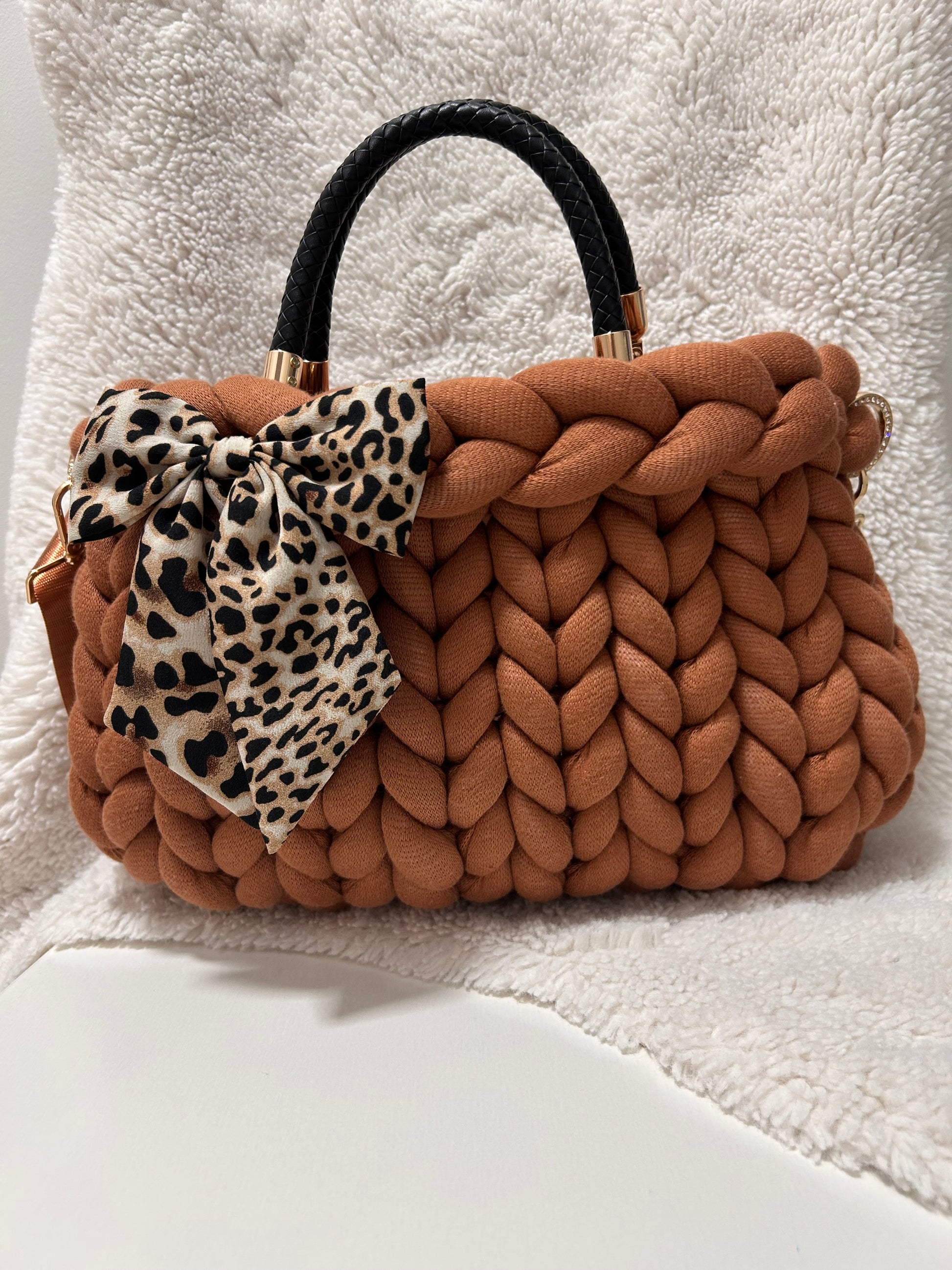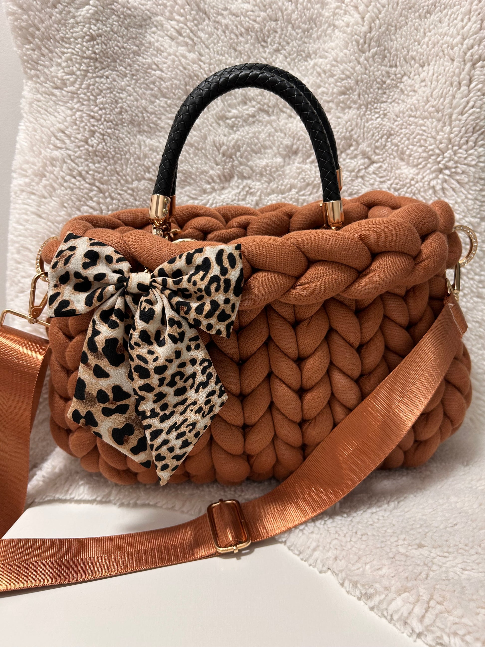 Il design chunky dona carattere e presenza, mentre i dettagli – manici, tracolla e fiocco decorativo – rendono la borsa elegante ma allo stesso tempo versatile, perfetta sia di giorno che di sera.